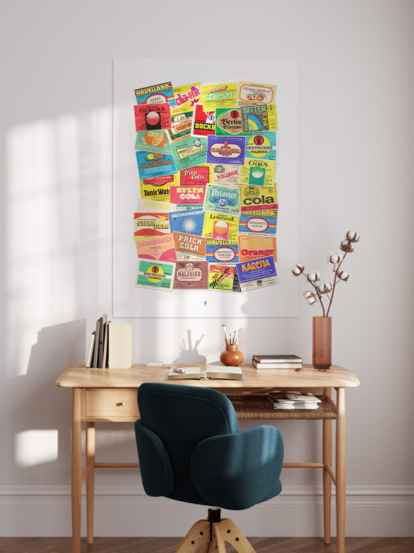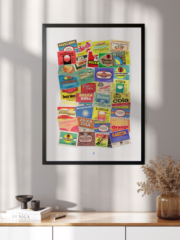 Tauche ein in die nostalgische Welt der DDR mit diesem einzigartigen Poster „Getränke der DDR“. Es zeigt eine Sammlung bunter Etiketten von Kultgetränken aus der ehemaligen DDR – von Limonaden und Cola bis hin zu Bier- und Brauseklassikern. Die farbenfrohe Collage bringt ein Stück Geschichte in dein Zuhause und versprüht Retro-Charme mit authentischem Design. Perfekt für Liebhaber von Vintage-Ästhetik, Sammler oder als stylische Wanddekoration in Küche, Wohnzimmer oder Barbereich.